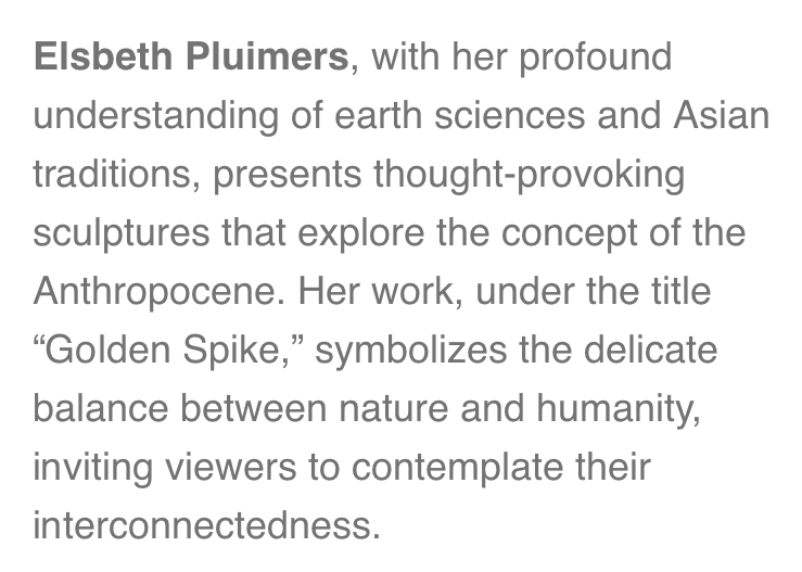 “Under the title ’Golden Spike’ biologist/geologist Elsbeth Pluimers shows a visual language of her fascination with the creation of the Earth. From her knowledge of earth sciences and of Asian traditions, she makes her works in clay, bronze and glass.